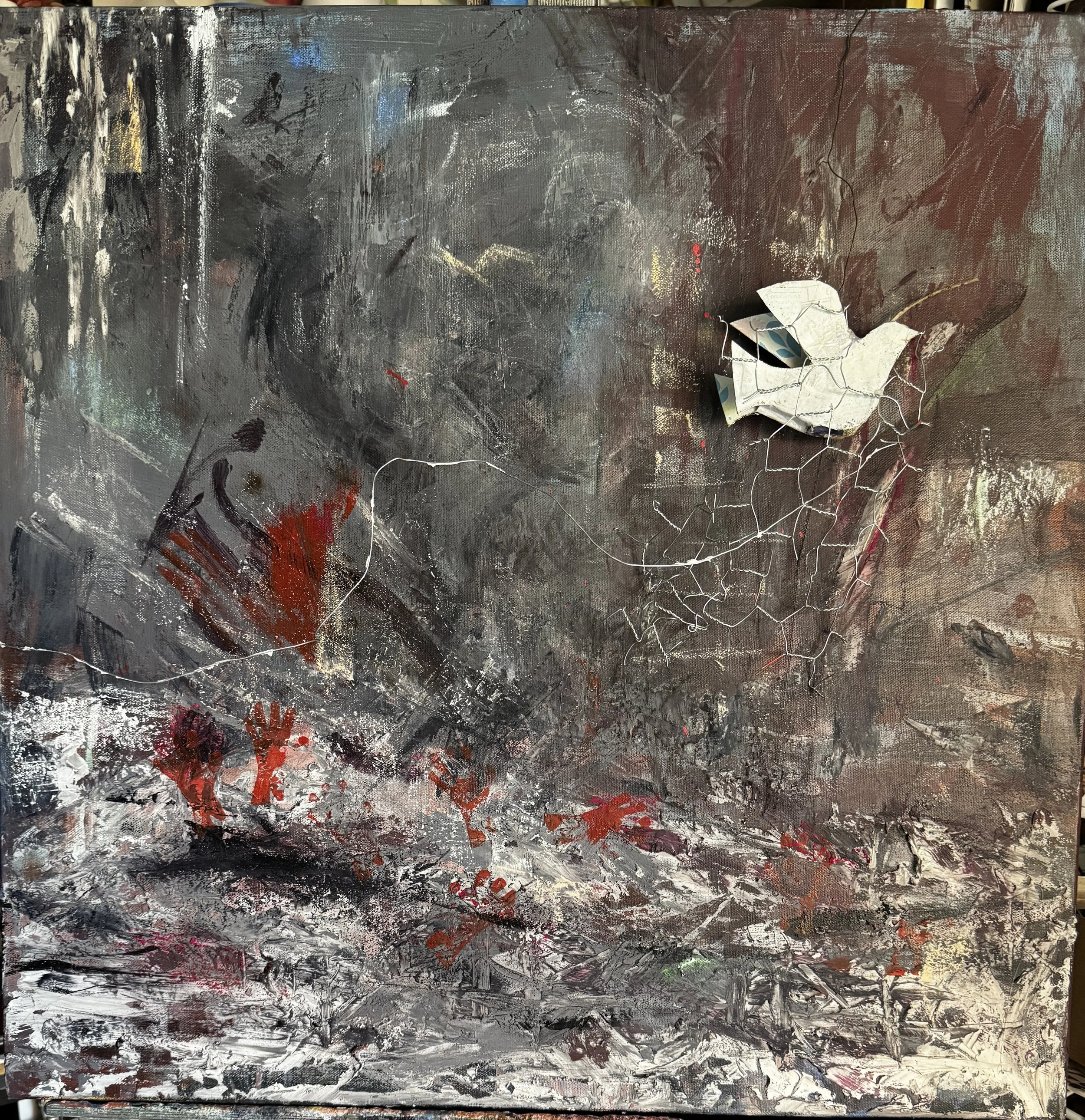 Acrylic, modeling paste, cardboard, and chicken wire