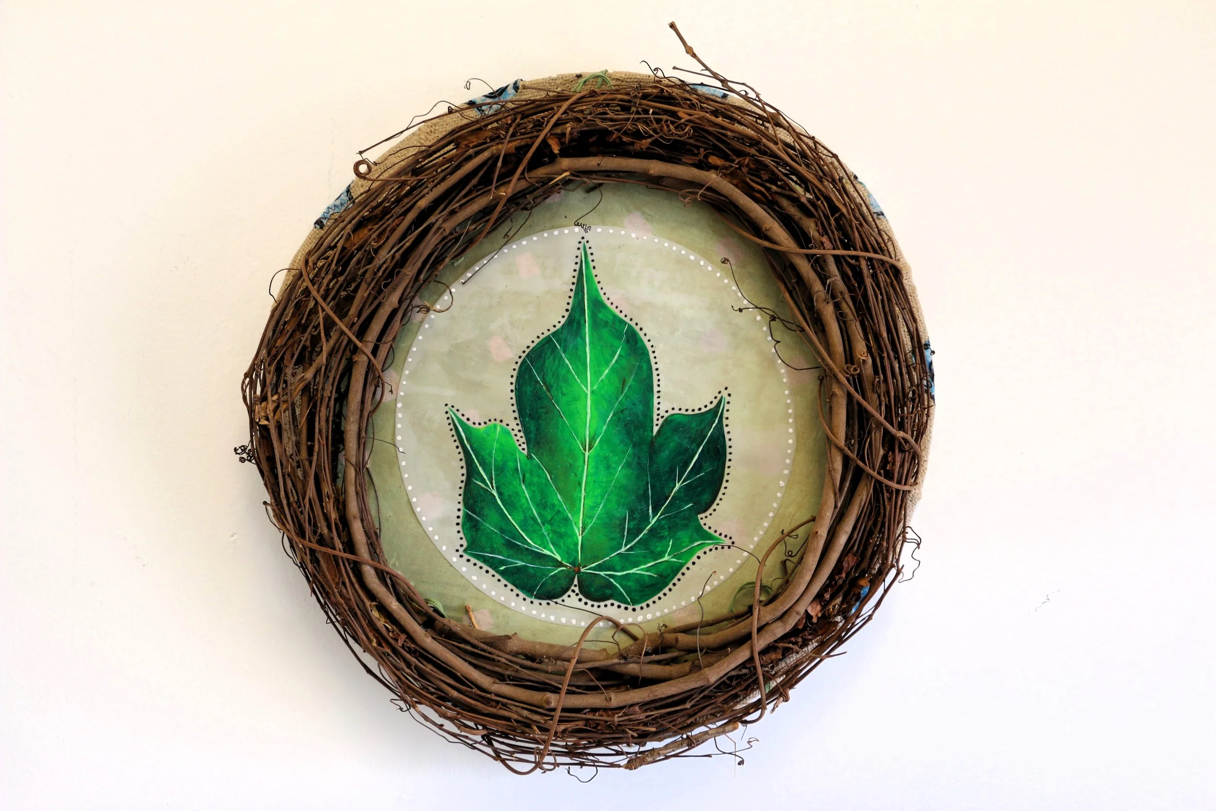Acrylic, ink, fabric, brass, acetate