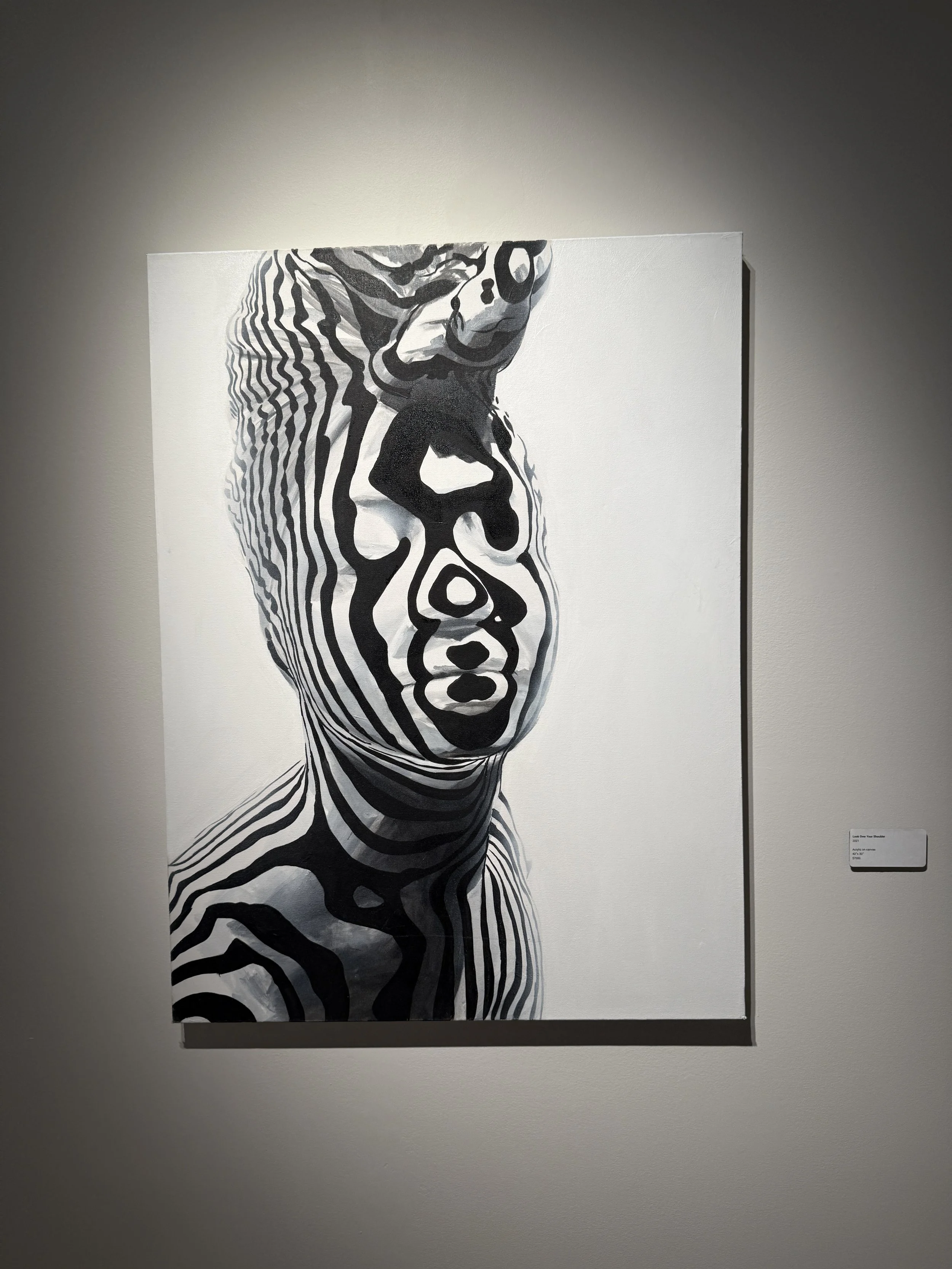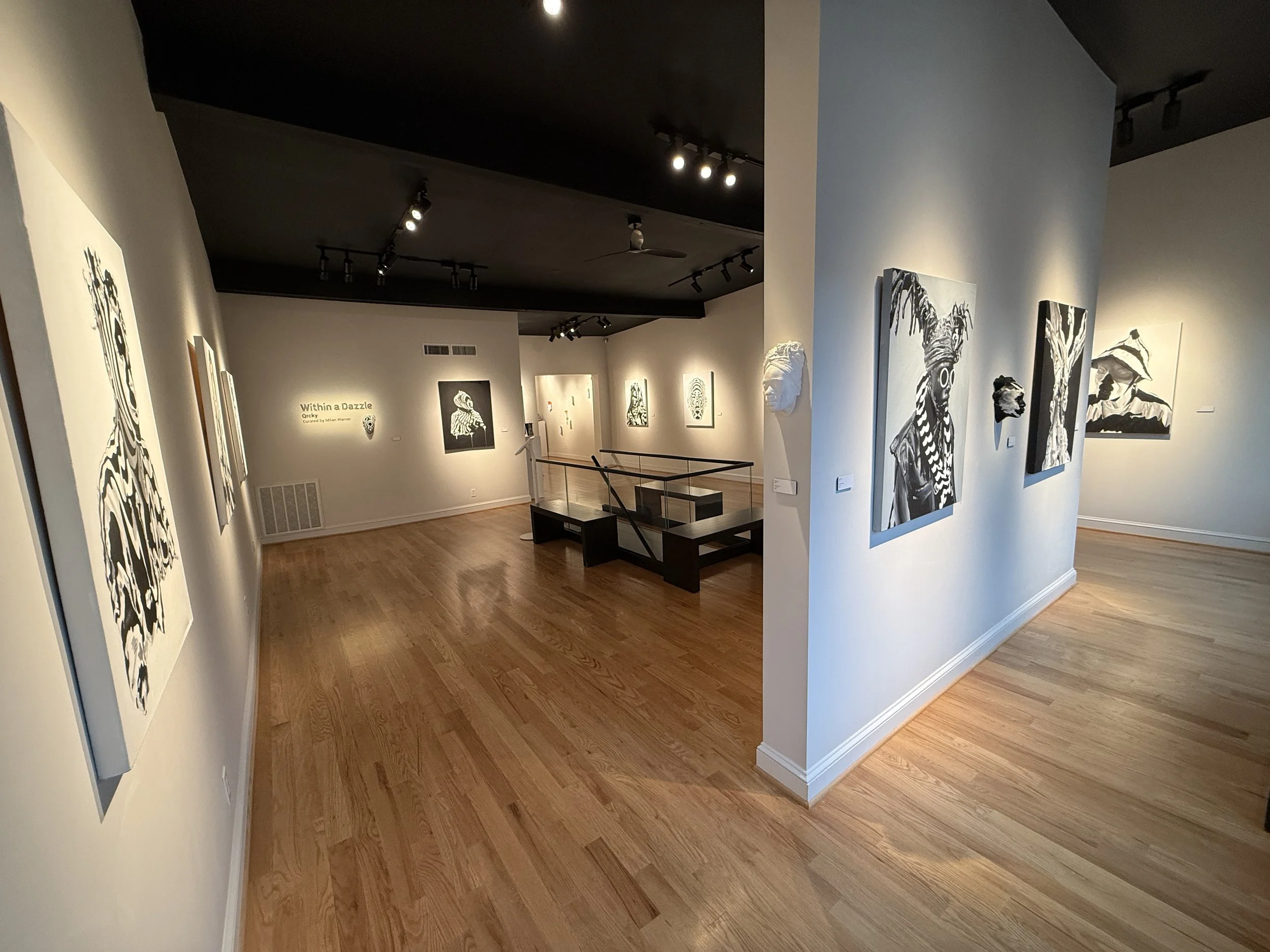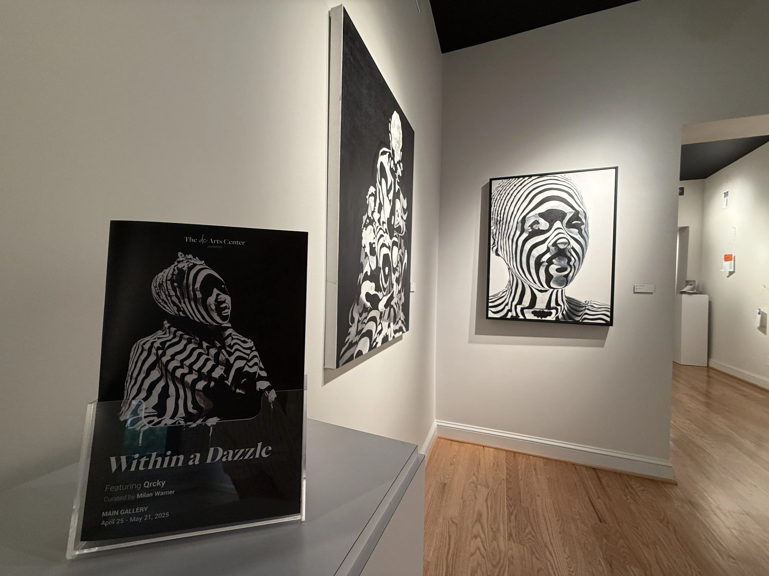 Within a Dazzle is an invitation to view Qrcky’s signature portraiture work defined by black and white stripes. To challenge viewer perception, Qrcky draws inspiration from the natural coloration of zebras and WW1 marine camouflage to explore themes of community and societal visibility within the Black diaspora. Qrcky’s work creates a ground for reflection regarding the complexity of human nature by looking to the individual human identity in conjunction with relationships. Through his work, Qrcky examines relationships from a personal to a grander cultural or societal scale.