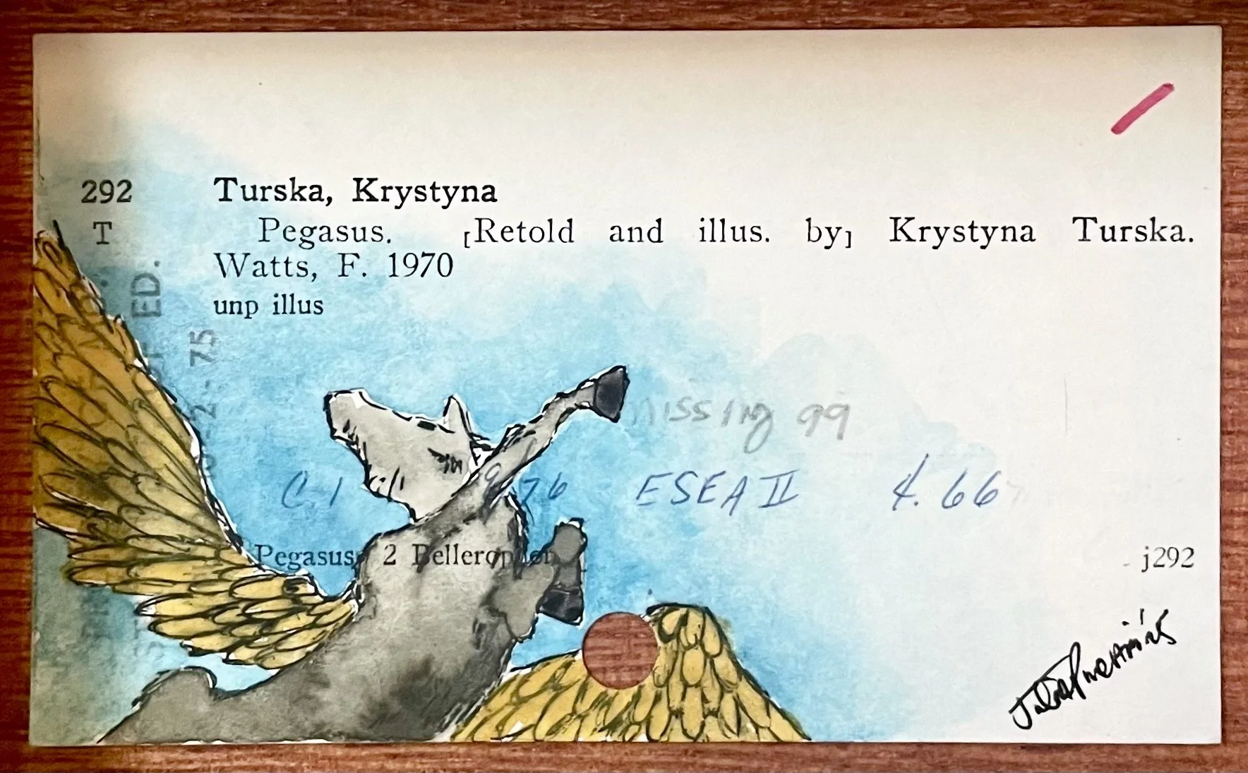 Turning Back a Page features small watercolor paintings on retired library catalog cards by artist Julia Porcari. Growing up with a librarian for a mother, along with earning a bachelor’s in literature, Porcari has long been exposed to literary works where she draws much of her creative inspiration. Porcari resourcefully repurposes the library catalog cards by depicting the very narratives the cards point to. The artist’s visual rendering of classic stories, folklore, and mythology aims to create a new avenue for viewers to approach literature.